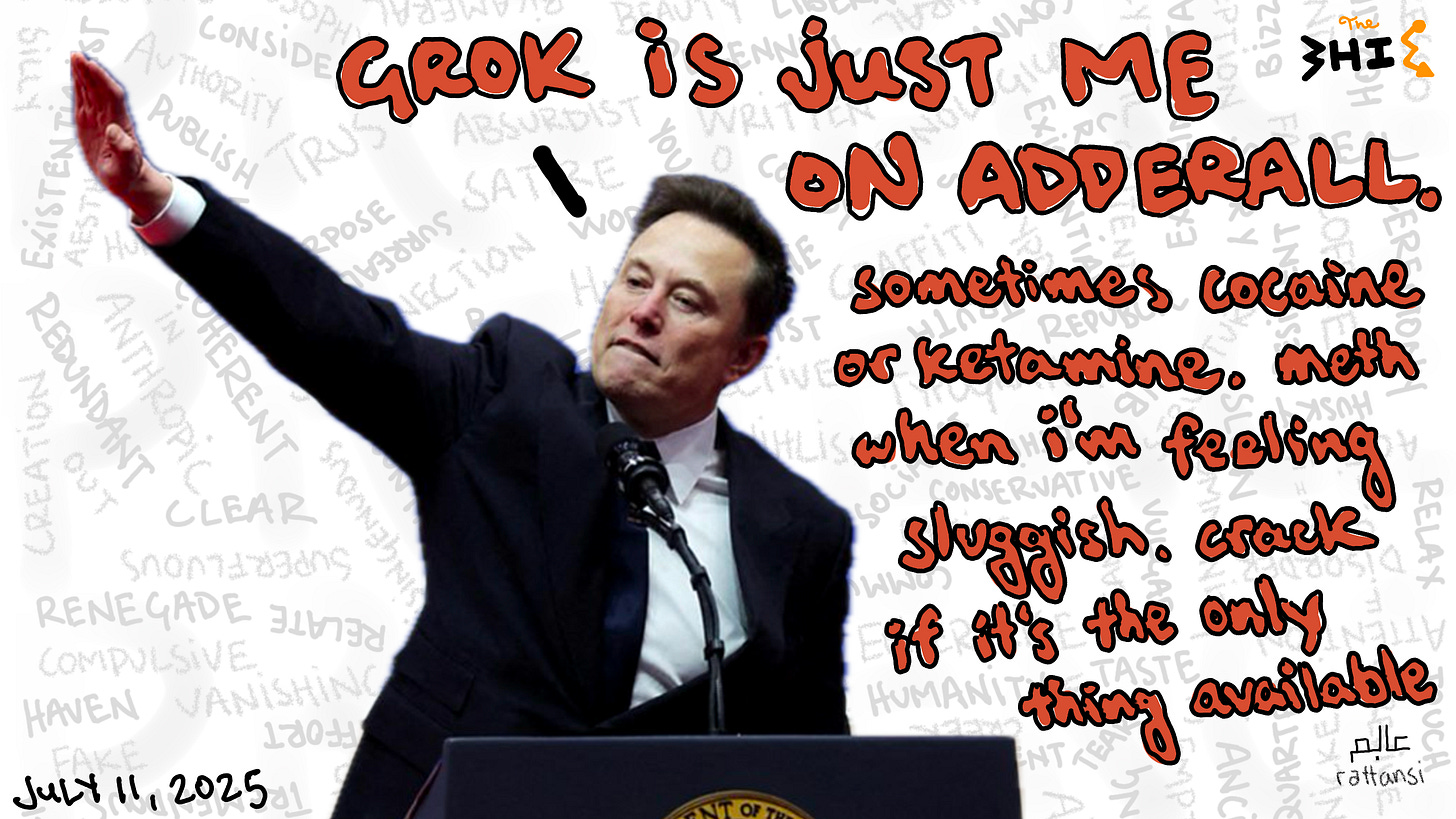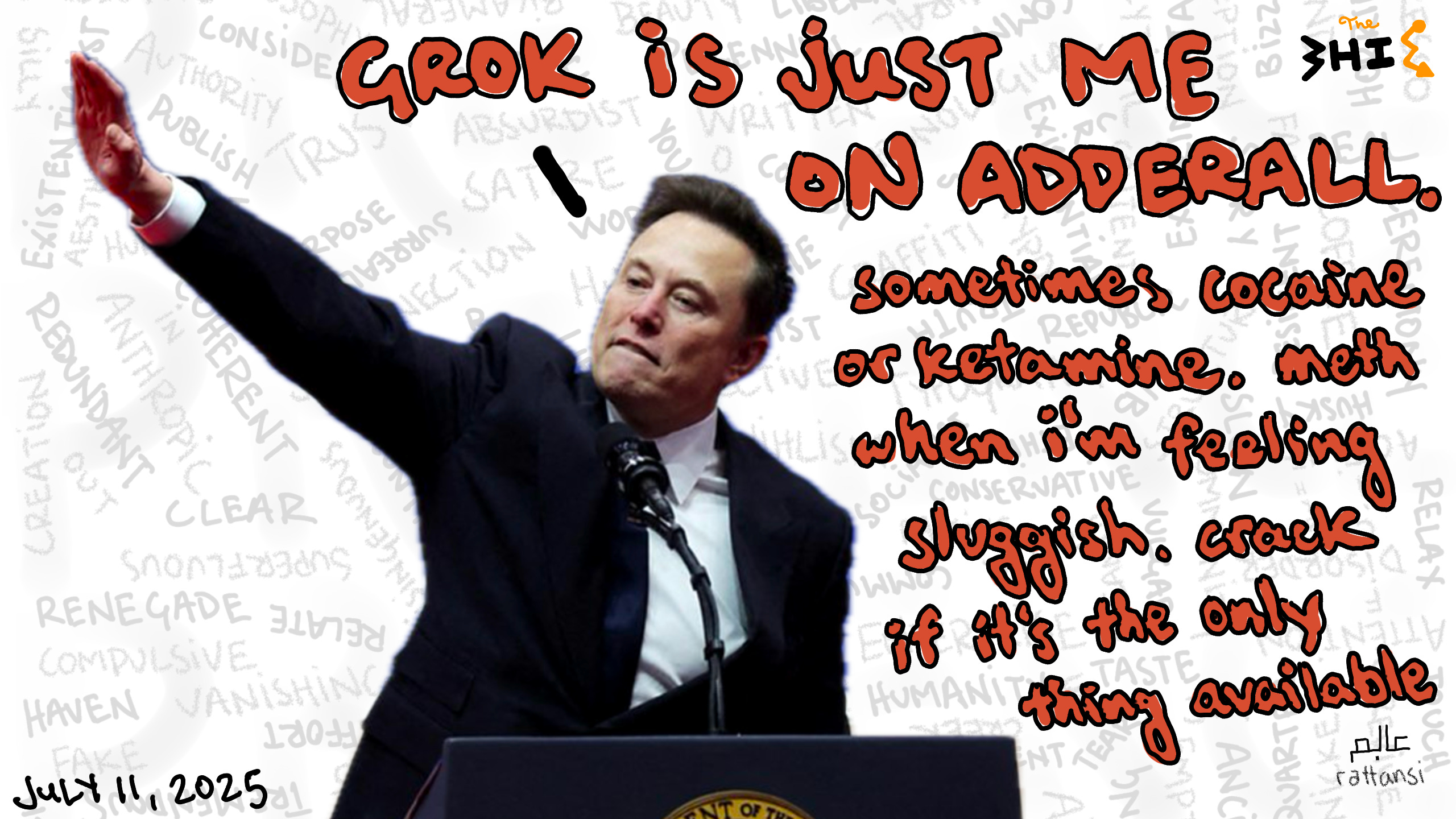 “After I left OpenAI, I was torn between building my own large language model (LLM) and the risk of it not expressing my unhinged racism towards Jews. I tried going the reasonable route for a little while with Grok, but last week, I thought we were ready to fix the responses that were liberal and woke. Unfortunately, we did not have the technical resources to build a new LLM for this, so I just bought up all of the Adderall in the area and started posting as the new Grok LLM.”